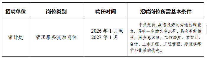 经学校同意,审计处设立管理服务流动岗1个,现就岗位校内招聘有关事项通知如下:
